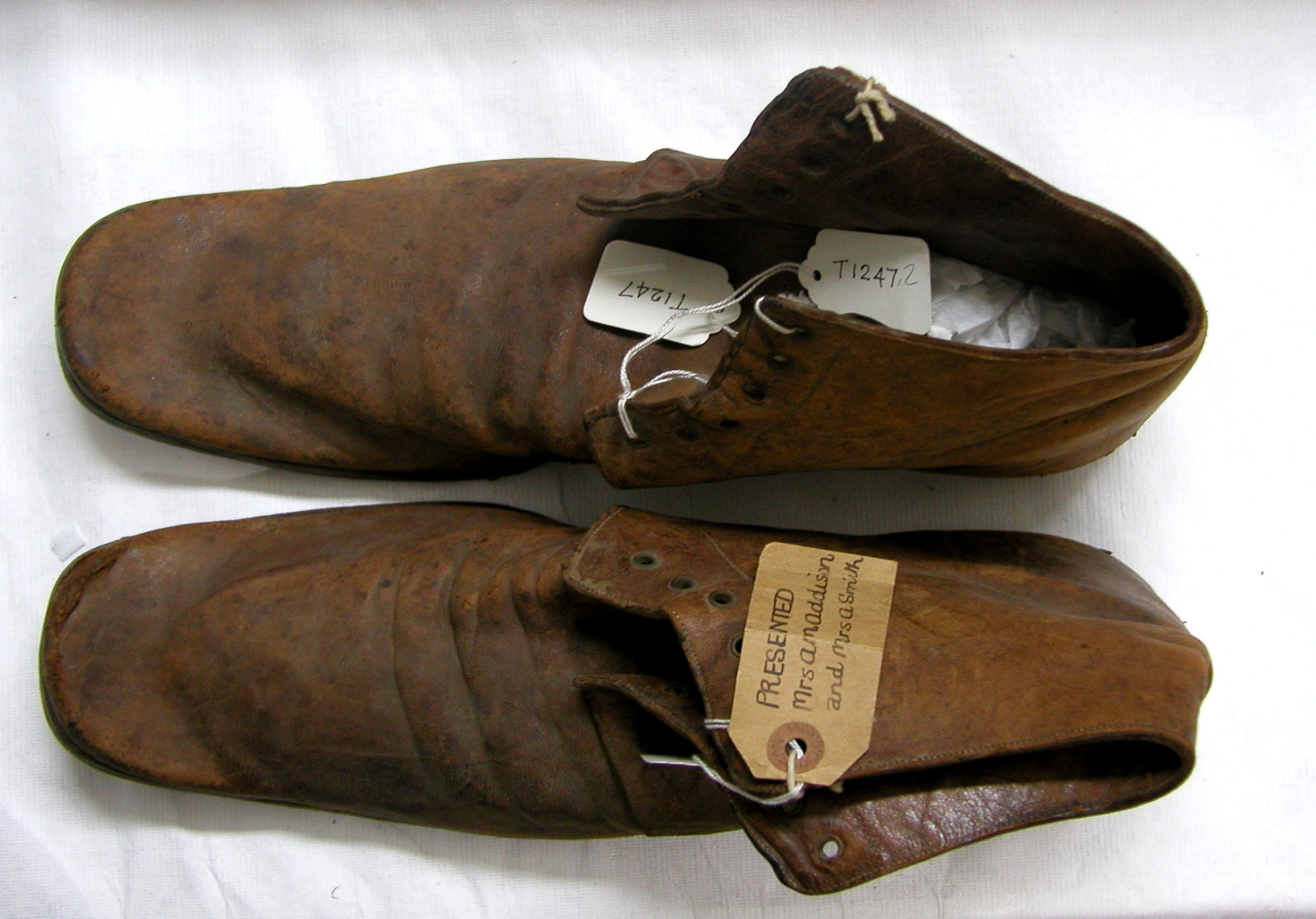 English: Ankle boot, brown leather with extended square toes, flat heels, laced front and tongues. boot, brown leather ankle boot with extended square toes. Flat heels, laced front and tongues.