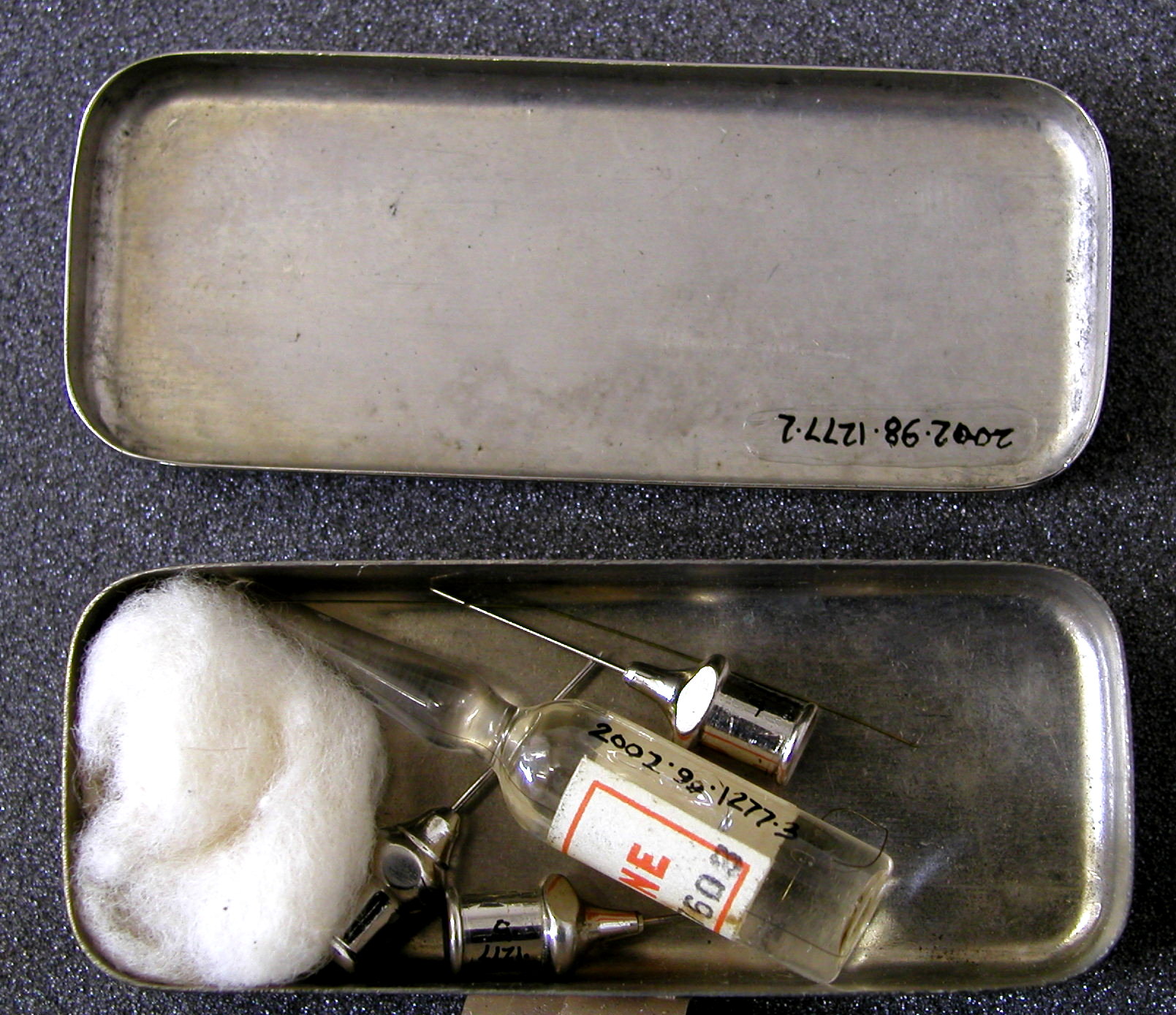 English: Medical equipment in metal container moulded undecorated stainless steel box with removable lid contains- small clear glass ampoule of clear colourless liquid, white paper label with red writing "1.7cc CORAMINE - OP - 67603" small ball of cotton wool piece of fine (brass) wire three hypodermic needles with stainless steel (bulbs)