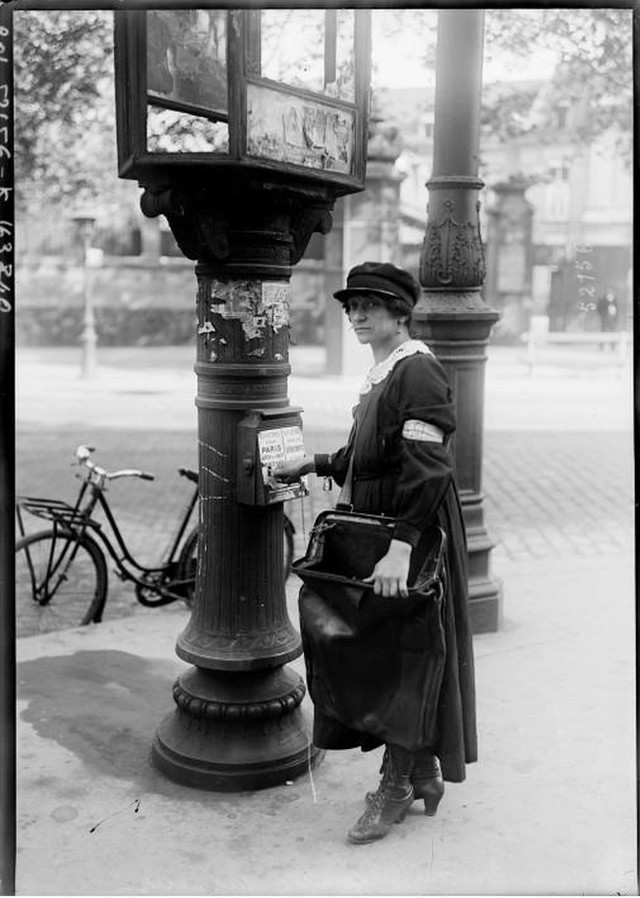 English: Female mail carrier, Jeanne Decorne, opening a post box in Paris during WWI. On September 28, 1915 to reduce the voids left by the mobilization of male carriers and reduce the delays in the distribution of mail, a decree that the wives of sub-agents killed or prevented from carrying out their duties due to the war could be employed as auxiliary mail carriers.