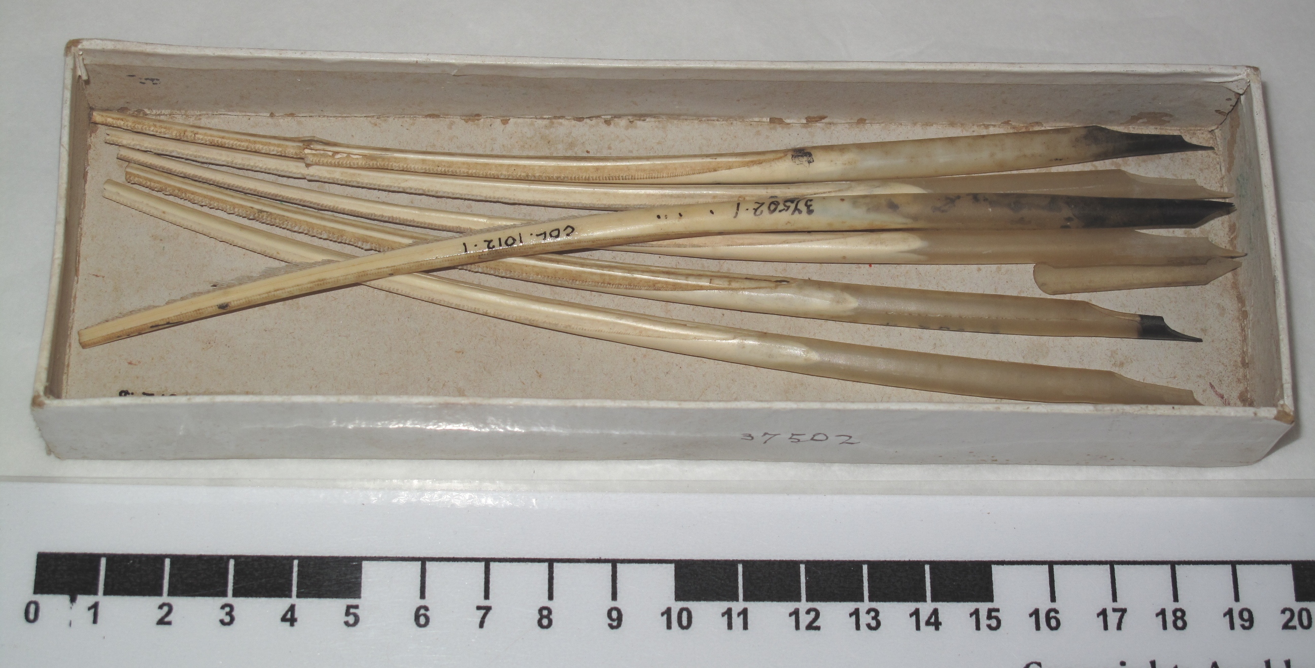English: Box of quill pens; Made from flight feather quills and cardboard. A long rectangular box made from cardboard with fitted lid, the lid has applied paper designs of a class room with a male school teacher at centre sitting at a desk holding a quill who is surround by children. The sides of the box reads- TOWER ROYAL QUILL PENS. Inside the box is 6 quills made from flight feathers from a bird. The quills have had the vanes of the feather trimmed back to the shaft, the tips are cut in to points and have black ink stains on the tips. The box also contains 2 small sticks of wax, one is orange the other is brown