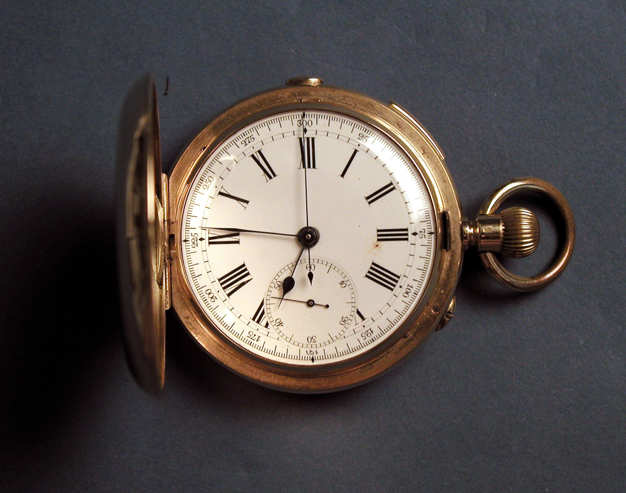 English: Hunting case pocket watch 18 carat gold case and watch, quarter repeating movement with one minute sub-dial inserted at 6 o'clock, stem wound, pin set, cut balance with overcoil spring, enamel dial, blue hour, minute and second hands, flat glass cover. Case has no decoration, hallmarked inside case. engraved on dome- "Presented to Edwin Bamford by the members of the legal profession in the Hawkes Bay Registration District 28th Sept 1893 " serial number on case- "27817" and "18c 817( ) "